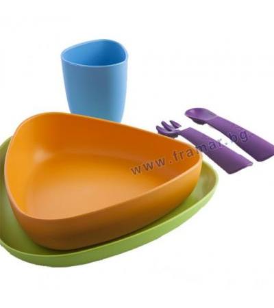 Упаковка: 2 шт тарелки, 1 стакан, 1 ложка и 1 вилка.