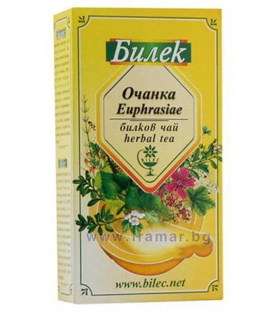 Применение: для блефарит и конъюнктивит: отваром 3 чайных ложки очанка с 2 стаканов воды за теплые глазные ванны - специальной чашечки. Внутренне (при желудочно-кишечных воспалительных заболеваниях) в виде запарка с одного стакана воды, как от наркотиков берется на кончике ножа.