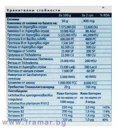 Пищевая добавка с пробиотик. Способствует баланс кишечной флоры, в случае болезни кишечная функция /из-за пищи, органические факторы, лечение антибиотиками/. Продукт содержит следующие пептични ферментов: амилазы, протеазы, липазы, пептидаза, целулаза, глюконаза, лактазы, малтаза, бромелин.