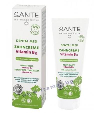 Медицинская зубная паста SANTE с витамином В12 был протестирован стоматологами. В ее активный комплекс входят натрия фторид, ксилитол и биосалвия, которые заботятся и защищают зубы и десны. Комбинация натрия, фтор и витамин В12 показал отличную эффективность против гингивита и бактерии, которые вызывают кариес. С мятой за приятный запах и свежее дыхание.